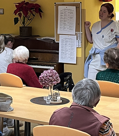 Senioři se s nadšením ke zpěvu připojili, čímž v domově vytvořili neopakovatelnou a velmi milou atmosféru plnou vzpomínek. Celý program vyvrcholil hrou na přání, která vykouzlila úsměvy na tvářích všech přítomných a ukázala, že empatie a vlídné slovo jsou v ošetřovatelské péči stejně důležité jako odborné dovednosti.