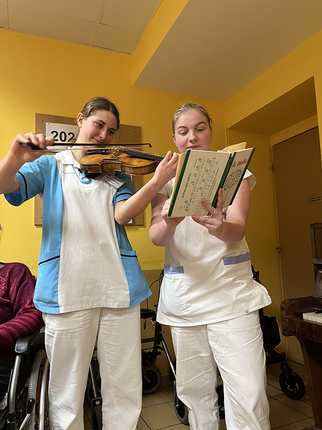 Během praktického předmětu Ošetřování nemocných připravili budoucí zdravotníci pro místní seniory „minikoncert“ zaměřený na aktivizaci a dobrou náladu. Dvě talentované žákyně doprovodily dopoledne hrou na housle a klavír, zatímco ostatní spolužáci se postarali o sborový zpěv a rozdali klientům vytištěné texty známých písní.