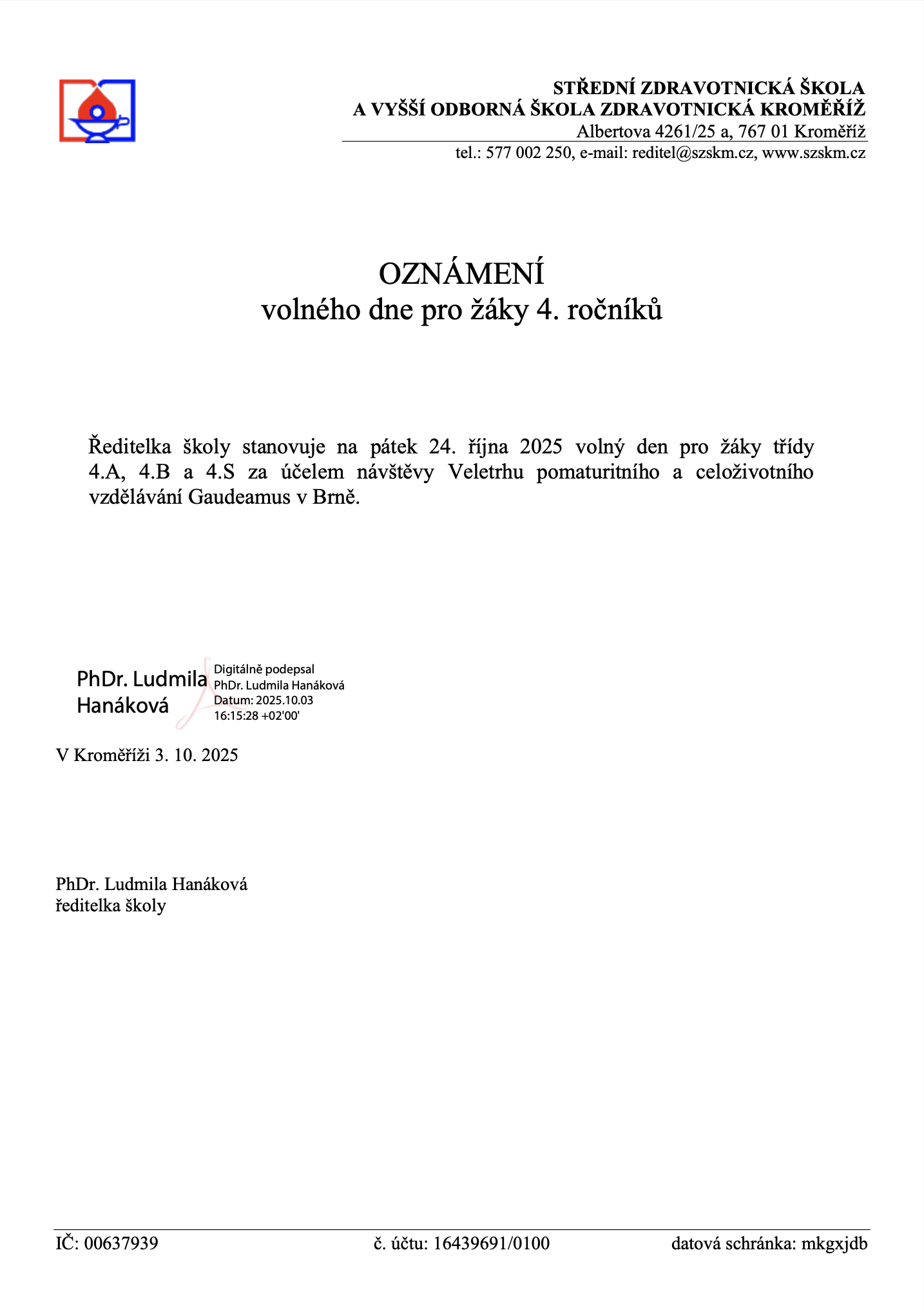 Ředitelka školy stanovuje na 24. října 2025 volný den pro žáky 4. ročníků.