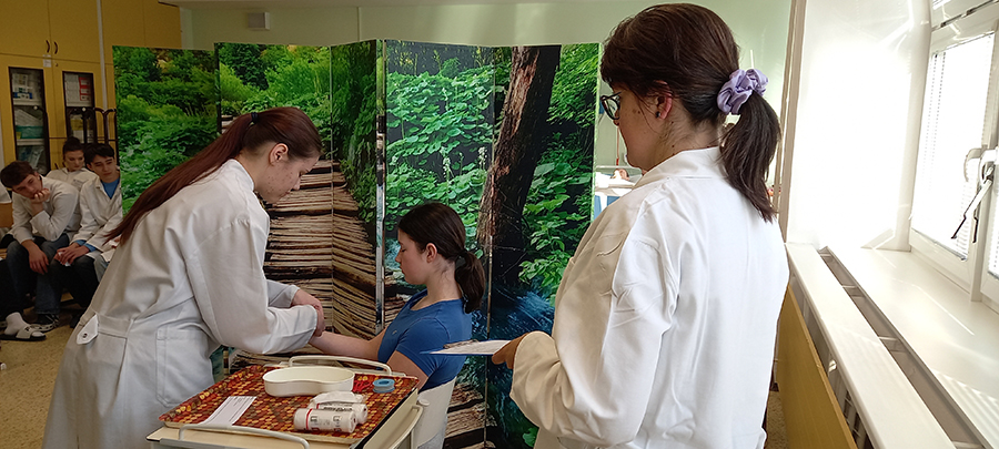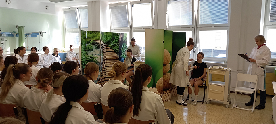 Na naší škole se konala tradiční soutěž v obvazové technice. Soutěžící měli za úkol zvolit správný typ obvazu a postup v obvazování podle zadané modelové situace. Každý se snažil pracovat pečlivě a ukázat, co se naučil v hodinách Ošetřovatelství.