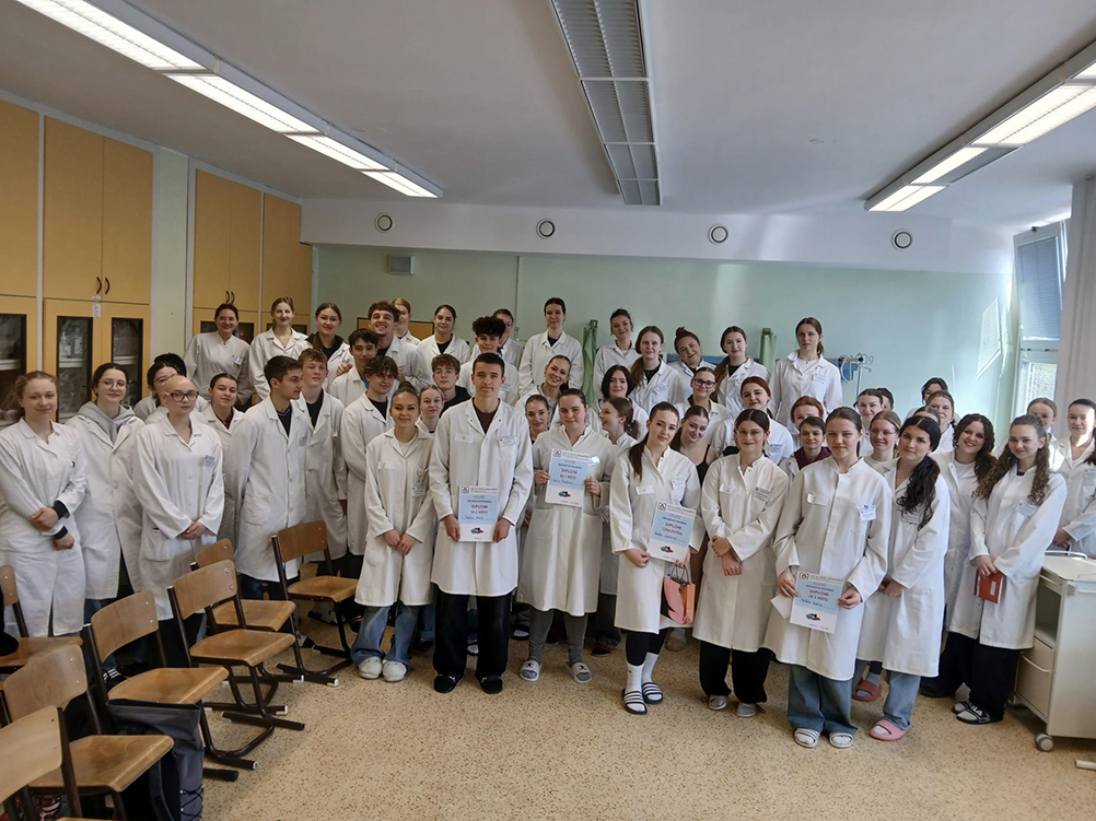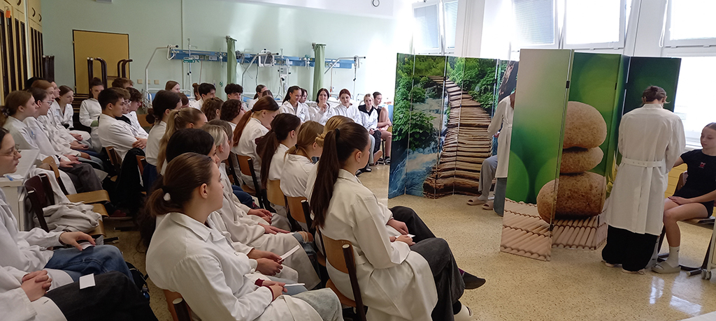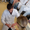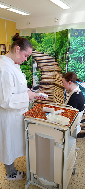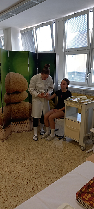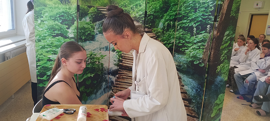 Porota hodnotila správnost obvazů, celkové provedení a komunikaci s pacientem. Na prvním místě se umístila žákyně Lucie Pavelcová ze třídy 1.B.