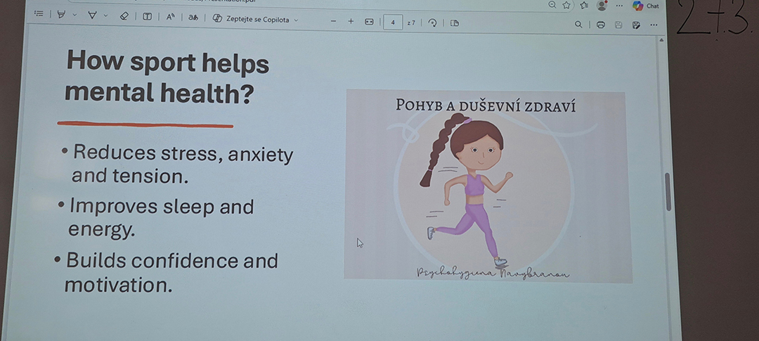 Jedním z hlavních témat byly Sport, fyzické a mentální zdraví, čemuž se věnovali žáci 1. ročníku a třídy 3. S. Žáci 1. ročníku připravili prezentace zaměřené na různé druhy sportů a pohybových aktivit. Ve svých pracích se soustředili nejen na jejich přínos pro fyzickou kondici, ale také na význam pohybu pro duševní pohodu člověka. Prezentace byly pestré, nápadité a ukázaly, že si žáci uvědomují důležitost zdravého životního stylu.