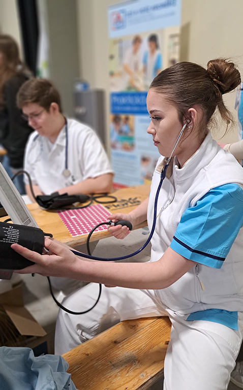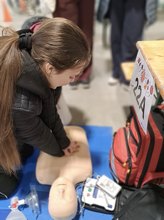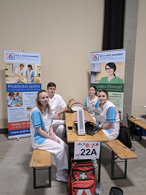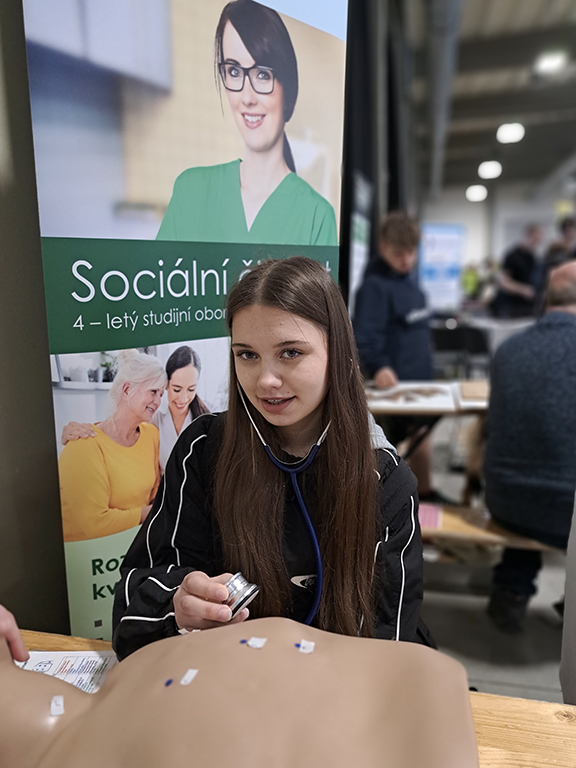 Účastníci si mohli projít desítky stanovišť, kde si vyzkoušeli nejrůznější činnosti – od technických oborů až po zdravotnictví. Nechyběla ani naše škola, která měla svůj vlastní stánek zaměřený právě na zdravotnické dovednosti.