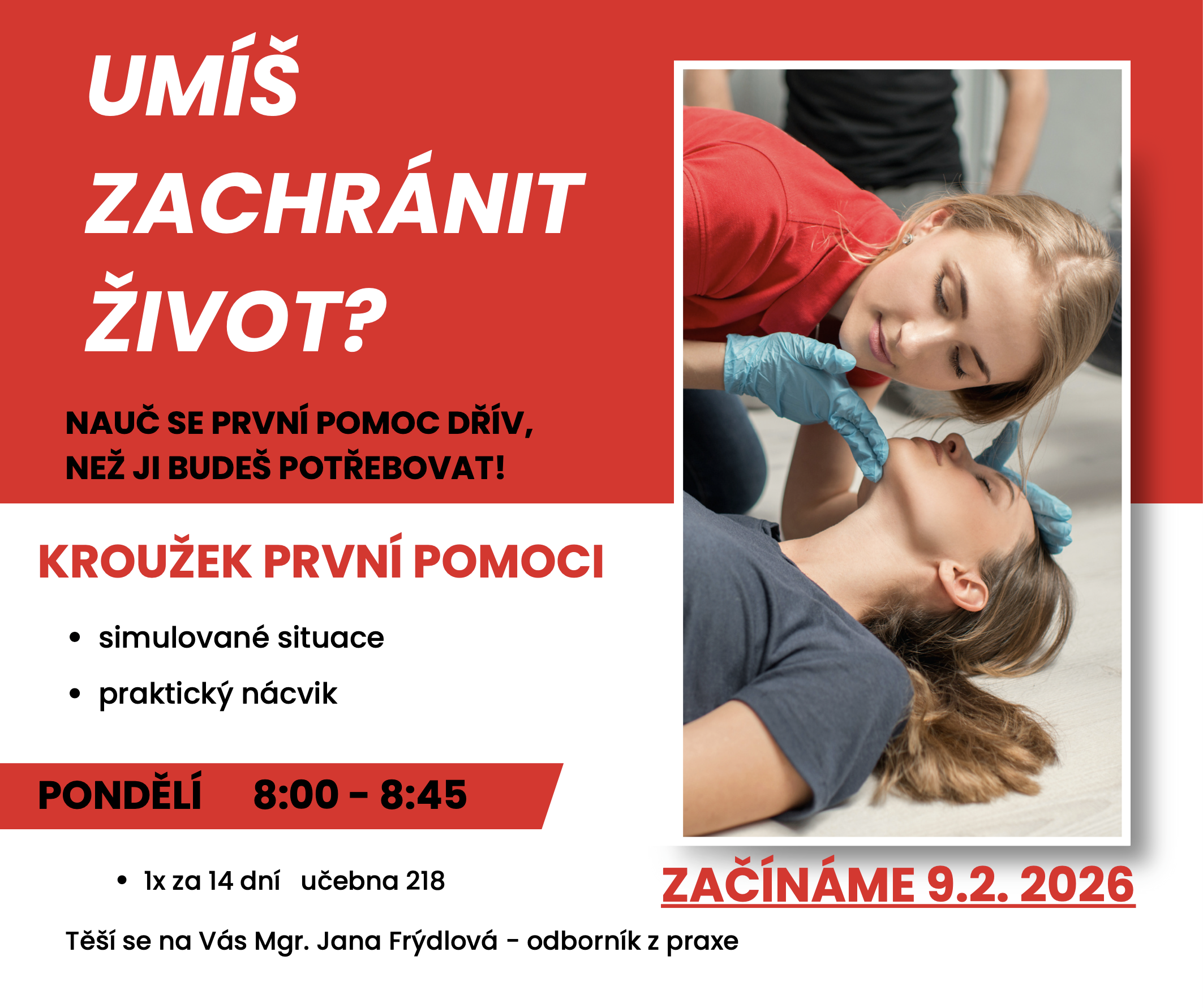 9. 2. Prvotní přístup k postiženému, základní vyšetření postiženého, KPR dospělého a dítěte. 23. 2. KPR dospělého a dítěte – pokračování |