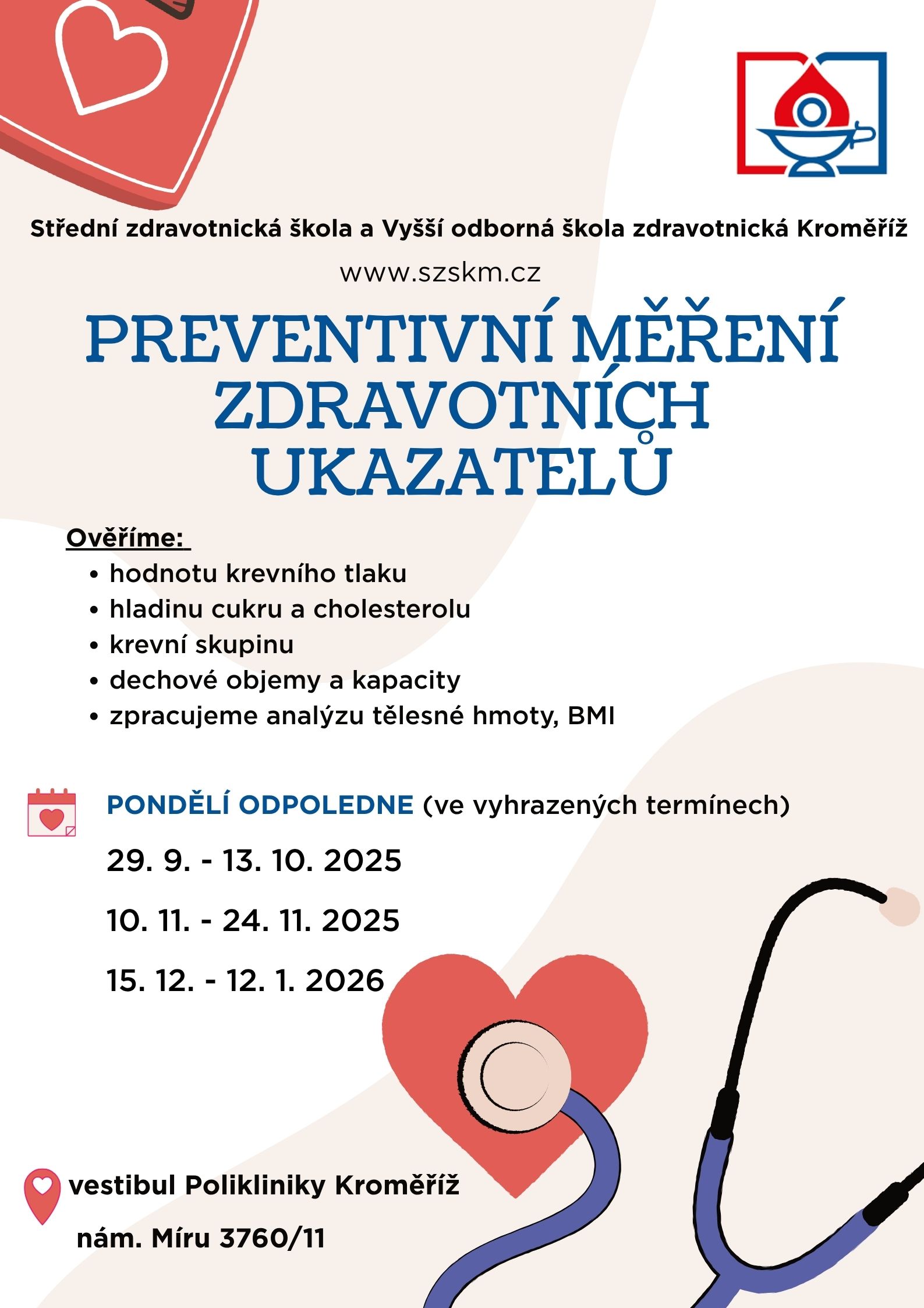 Od 29. září 2025 do 12. ledna 2026 nabízíme orientační měření zdravotních ukazatelů pro zájemce z Kroměříže a okolí. Žáci 3. ročníku oboru Praktická sestra budou připraveni ve vyhrazených termínech v pondělí odpoledne. Najdete nás v budově polikliniky na náměstí Míru v Kroměříži.